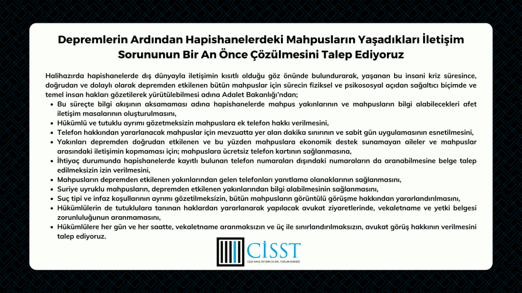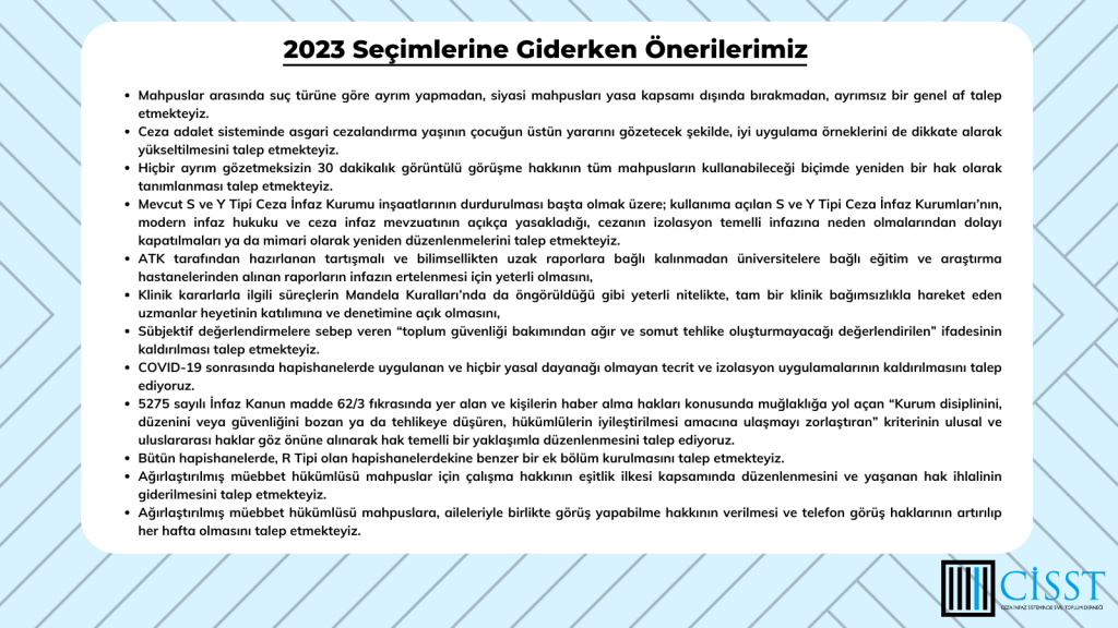 Ceza İnfaz Sisteminde Sivil Toplum Derneği olarak Türkiye’nin içinde bulunduğu seçim gündeminde hapishaneler ve mahpusların sorunlarının yeterince gündeme getirilmediğini ve