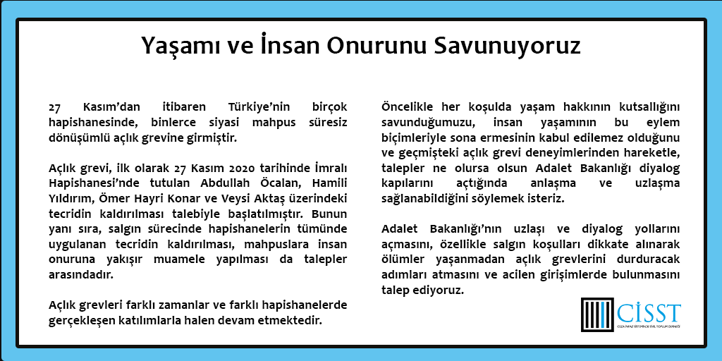 27 Kasım’dan itibaren Türkiye’nin birçok hapishanesinde, binlerce siyasi mahpus süresiz dönüşümlü açlık grevine girmiştir. Açlık grevi, ilk olarak 27 Kasım